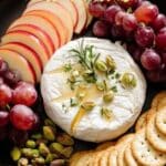 A delicious and elegant Baked Brie recipe featuring a creamy triple cream brie wheel baked with honey and fresh herbs. Perfectly paired with toasted baguette slices, crackers, fresh apples, grapes, and nuts for a warm, indulgent appetizer or snack.