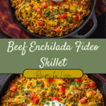 Beef Enchilada Fideo Skillet is a bold, hearty one-pan Tex-Mex meal made with seasoned ground beef, quick-cooking fideo pasta, enchilada sauce, and melty cheese. Ready in just 20 minutes, this comforting skillet dish is perfect for busy weeknights and full of satisfying flavor.