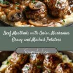 Beef Meatballs with Onion Mushroom Gravy and Mashed Potatoes is a hearty comfort-food classic featuring tender beef meatballs simmered in a rich onion and mushroom gravy, served over creamy mashed potatoes.