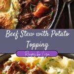 Beef Stew with Potato Topping is a hearty, comforting dish that combines tender chunks of beef and vegetables in a rich, savory gravy — all baked under a golden, buttery layer of mashed potatoes. It’s like a mash-up of classic beef stew and shepherd’s pie, and it’s the kind of meal I love when I want something warm and satisfying.