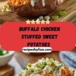Hearty roasted sweet potatoes stuffed with spicy buffalo shredded chicken, topped with melted cheese and creamy dressing for a comforting and flavorful meal.