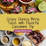 Cheesy, crispy beef birria tacos served with flavorful consommé for dipping. This recipe features homemade birria de res shredded and combined with melted Oaxaca cheese inside corn tortillas, creating authentic, food truck-style quesabirria tacos.
