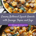 Creamy Butternut Squash Gnocchi with Sausage, Thyme, and Sage is a cozy and indulgent dish featuring pillowy gnocchi coated in a velvety butternut squash sauce with savory sausage and fragrant herbs. It’s a comforting one-pan meal perfect for fall evenings.