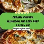A rich and comforting puff pastry pie filled with tender chicken, earthy mushrooms, and sweet leeks in a creamy herb sauce, baked under a golden flaky pastry lid.