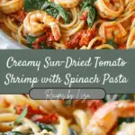 A rich and flavorful pasta dish featuring tender shrimp in a creamy garlic sauce with sun-dried tomatoes and wilted spinach — a cozy, restaurant-style meal you can make in just 30 minutes.