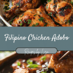 Filipino chicken adobo is a savory, tangy, and comforting dish made by simmering chicken in a base of soy sauce, vinegar, garlic, bay leaves, and black pepper. The flavors deepen over time, and the result is tender, juicy chicken in a glossy, flavorful sauce — ideal over steamed rice.