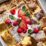 I find this casserole is at its absolute best when served warm, fresh out of the oven, so those caramelized edges are still crunchy and the custard remains tender. A generous dusting of powdered sugar and some fresh berries on top immediately add brightness and color, making it picturesque enough to impress any brunch company.