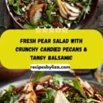 A fresh and elegant pear salad featuring crisp greens, sweet ripe pears, crunchy candied pecans, creamy cheese, and a bright balsamic dressing.