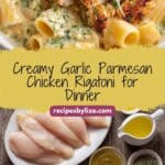 Quick and easy Garlic Parmesan Chicken Rigatoni, a creamy and flavorful Italian-American dish perfect for a weeknight dinner. Tender chicken breast pieces are cooked in a rich garlic and Parmesan cream sauce and tossed with al dente rigatoni pasta, delivering a hearty main course ready in under 40 minutes.