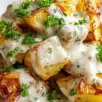 6. Toss Potatoes with Sauce: Once the potatoes are done, remove them from the oven and let cool for about 5 minutes. Reserve some of the crispy browned bits from the pan for garnish. Transfer the potatoes to a large bowl and gently toss them with the creamy herb sauce until they are evenly coated.