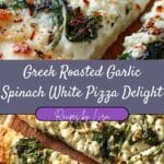 Greek Roasted Garlic Spinach White Pizza Delight is a Mediterranean-inspired pizza with a creamy roasted garlic white sauce, sautéed spinach, and layers of mozzarella, feta, and herbs on a crispy golden crust. It’s fresh, cheesy, and packed with flavor — no red sauce required.