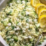 Easy and refreshing Lemon Orzo Salad made with tender orzo pasta, fresh Persian cucumbers, fragrant herbs, crumbled feta cheese, and a zesty lemon olive oil dressing. Perfect as a light lunch or a flavorful side dish.