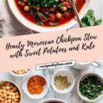 A hearty, vegan, and gluten-free Moroccan-inspired chickpea stew packed with warm spices, sweet potatoes, and nutrient-rich kale, perfect for a comforting main dish.
