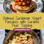 Delicious oatmeal cardamom yogurt pancakes served with a luscious caramel pear compote. These fluffy pancakes feature the warm spice of cardamom and the wholesome texture of rolled oats, balanced with creamy Greek yogurt for extra tenderness. The sweet and tangy caramel pear compote makes this breakfast or brunch dish truly special.