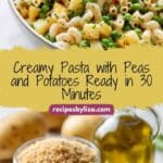 This Pasta With Peas & Potatoes Recipe makes about 4 hearty servings, perfect for a family meal or sharing with friends. Prep takes roughly 10 minutes, mostly peeling and chopping the potatoes and grating the garlic and cheese. The total cook time is about 30 to 35 minutes, including broth reduction and pasta cooking. There’s no resting time needed, allowing you to get this delicious meal on the table without delay.