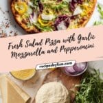 This Salad Pizza recipe combines a crispy homemade or store-bought pizza crust topped with melty fresh mozzarella and garlic, finished with a vibrant Italian-style salad featuring arugula, radicchio, red onion, and pepperoncini. Tossed in a tangy red wine vinaigrette, this refreshing pizza is perfect for spring and summer gatherings, offering a bright and flavorful twist on traditional pizza.