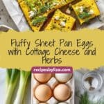 Fluffy sheet pan eggs baked with cottage cheese, fresh herbs, and feta cheese, delivering a high-protein, easy-to-make dish perfect for meal prep or serving a crowd at breakfast or brunch.