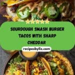 I love this recipe because it’s fast, fun, and totally satisfying. The sourdough tortillas get perfectly crisp on the outside while staying chewy inside, and the smash burger technique adds deep flavor and texture. Sharp cheddar melts right into the beef, and I can top each taco just like a classic burger—pickles, lettuce, tomato, onions, sauce, you name it. Whether I’m feeding a crowd or just making a quick weeknight dinner, these always get rave reviews.