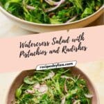 A refreshing and crisp Watercress Salad with crunchy radishes and fennel, dressed in a tangy honey-mustard vinaigrette and topped with salted roasted pistachios for a delightful texture contrast.