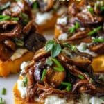 This Wine Braised Beef & Goat Cheese Crostini recipe features tender, slow-braised chuck roast cooked with mushrooms, onions, garlic, and red wine until perfectly shreddable. Served atop crunchy, garlic-rubbed crostini spread with creamy goat cheese, this appetizer beautifully balances rich and savory flavors with a crisp texture, making it ideal for entertaining or a sophisticated snack.
